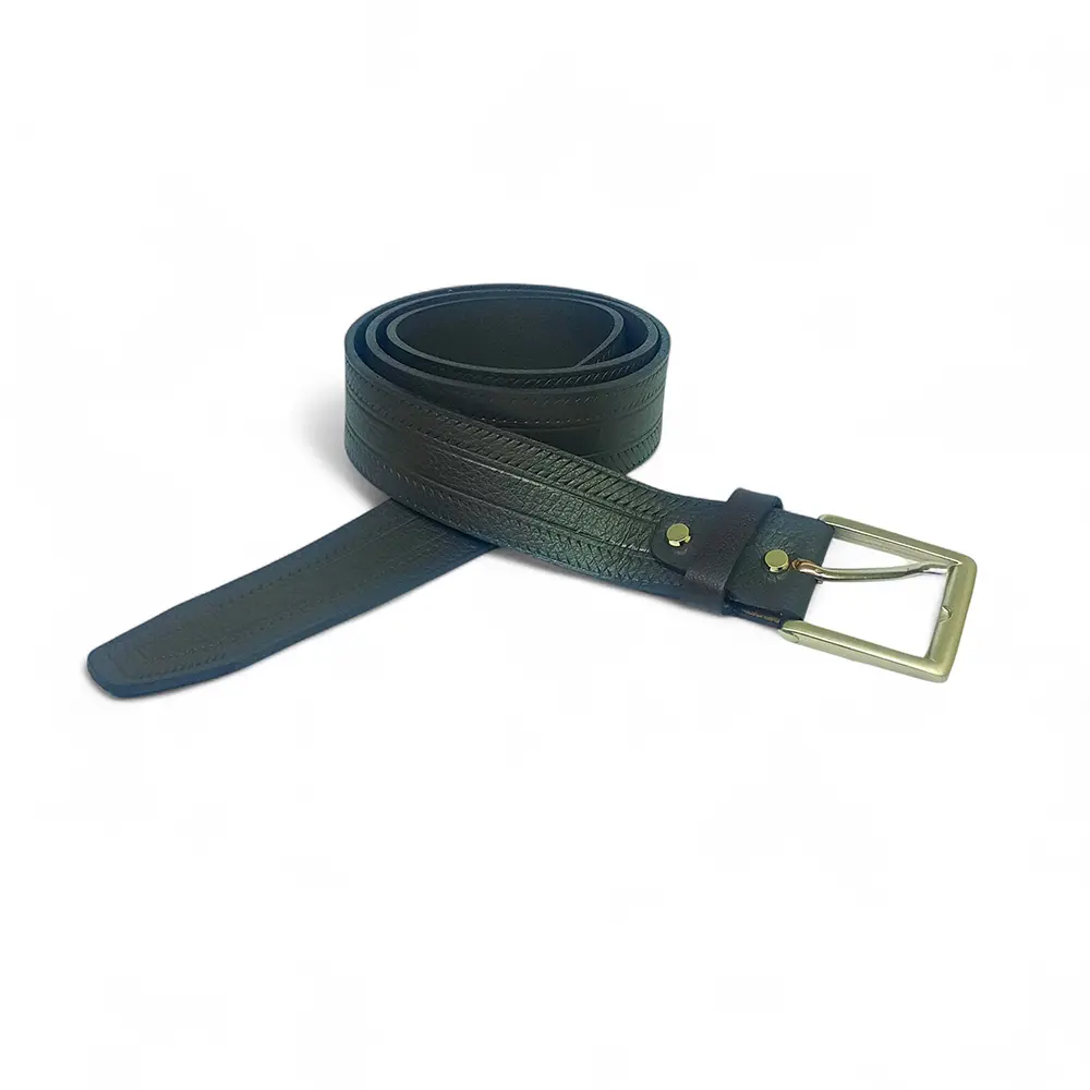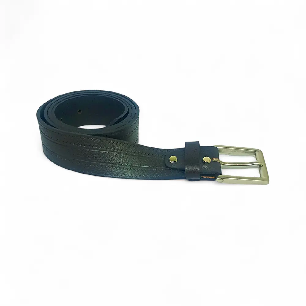 Upgrade your casual wardrobe with the LB-316 Black Leather Belt featuring bold stitching and a strong brass-finish pin buckle. The textured finish and double rivets make it a reliable companion for jeans or cargo pants. A fusion of strength and everyday style.