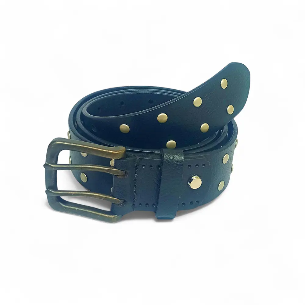 The antique brass buckle complements the studs, giving this belt a vintage feel while providing a secure hold. Crafted from 100% genuine full grain leather, it’s built to last, developing a distinctive patina with wear.